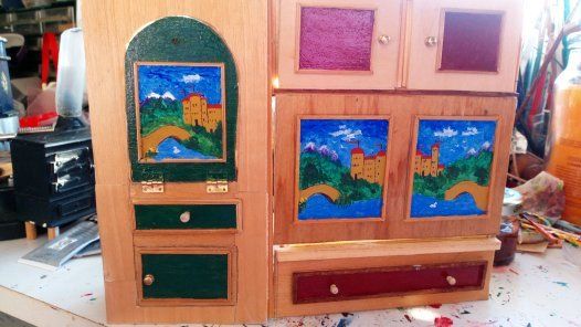 So hijacked the spare room and set up my scroll saw, got the pencils, set square and rulers into use and off we go! I knew this would take a while to create so I decided to put updates and photos onto Valley View silver facebook page to ensure I finished it. I found a stove that had come with a dollshouse bought several years ago which was ideal. Making the cabinet that is set on an angle was a bit tricky, as was cutting the panels out for the cabinet doors hence the wood filler. I couldn't fix the cabinets until I had painted the Roses and Castles which I was impatient to do. I love working with wood but probably rush it too much. I have added photos but they aren't necessarily in the right order - my website editing skills need more practise!